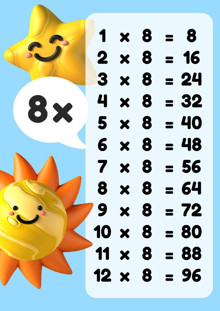 adminMarch 30, 2026Times Table8 Times Table – Learn Multiplication 1 to 12 Home Times Table 8 Times Table – Learn Multiplication 1 to 12 The Times 8 table involves doubling numbers three times. It helps learners recognize patterns in larger numbers and improve mental calculation speed. Use this Times 8 chart to build confidence in handling bigger multiplication facts.